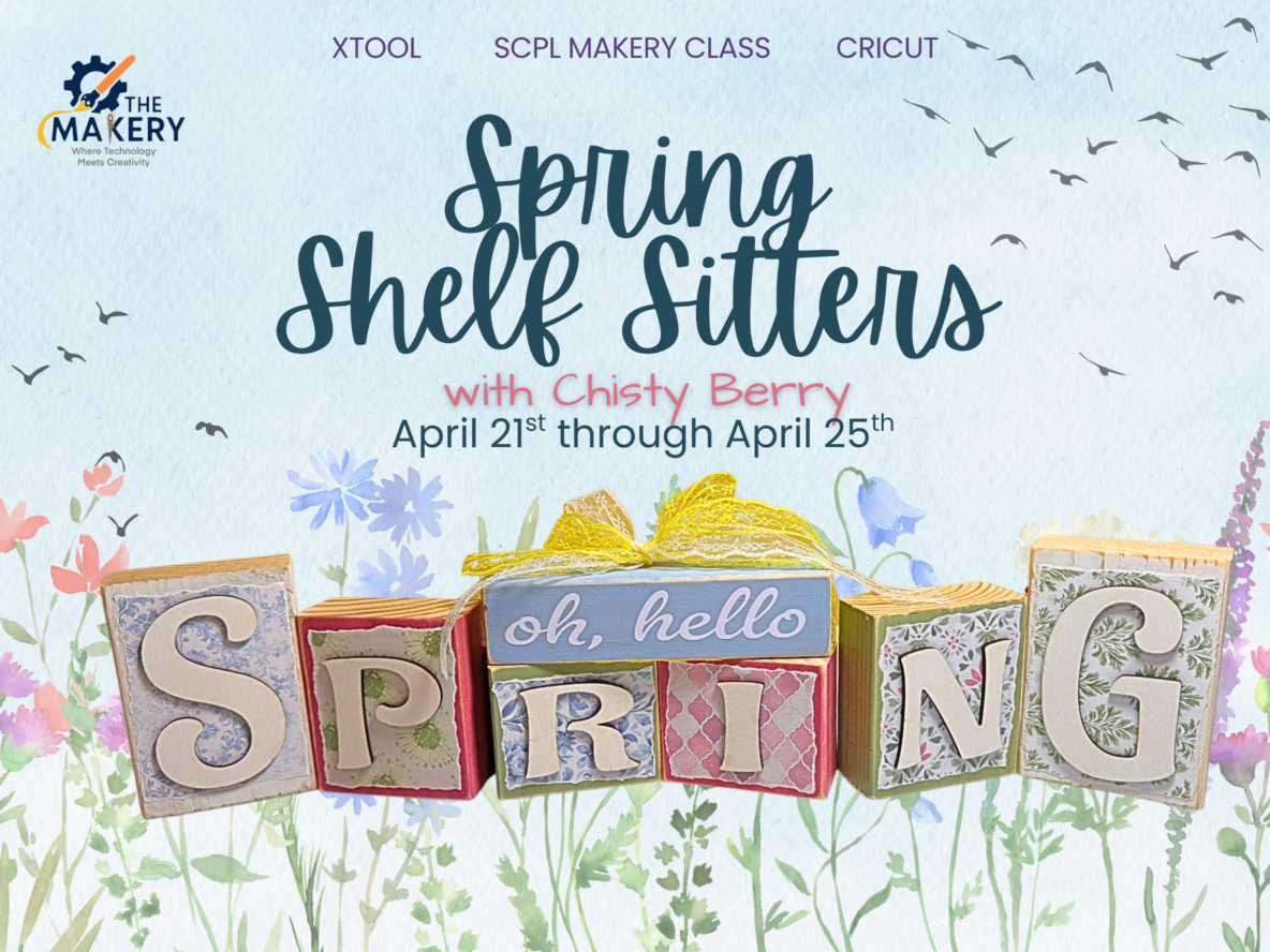 Join Christy in the SCPL Makery to create some beautiful spring shelf sitters to brighten up your home or to give to a friend! She will guide you through the process of learning to use the Cricut and xTool laser to create these fun shelf sitters. Ages 12 and up are welcome. No experience is necessary.