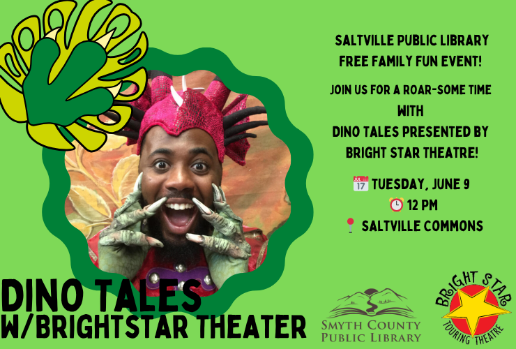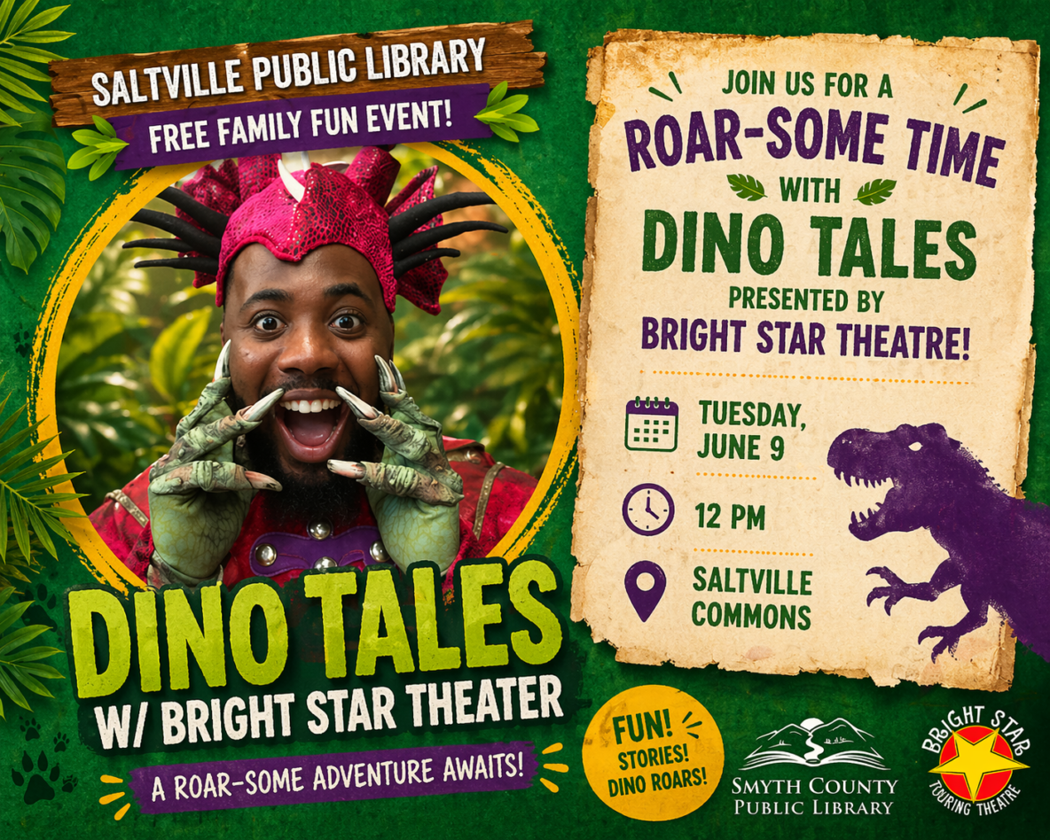 Join us on June 9 at 12 PM at the Saltville Commons as Bright Star Theater brings dinosaurs to life with their exciting performance, Dino Tales! Travel back in time and meet fascinating prehistoric creatures while enjoying a fun, interactive show the whole family will love.