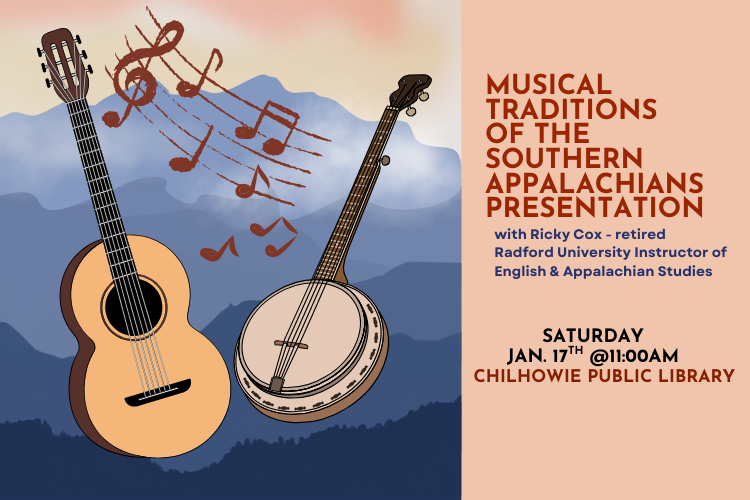 Join us at Chilhowie Library on Saturday, Jan. 17th at 11:00am. Ricky Cox will be onsite speaking about the history of music in Southern Appalachia and playing old-time banjo tunes, ballads, and lyrical folk songs.