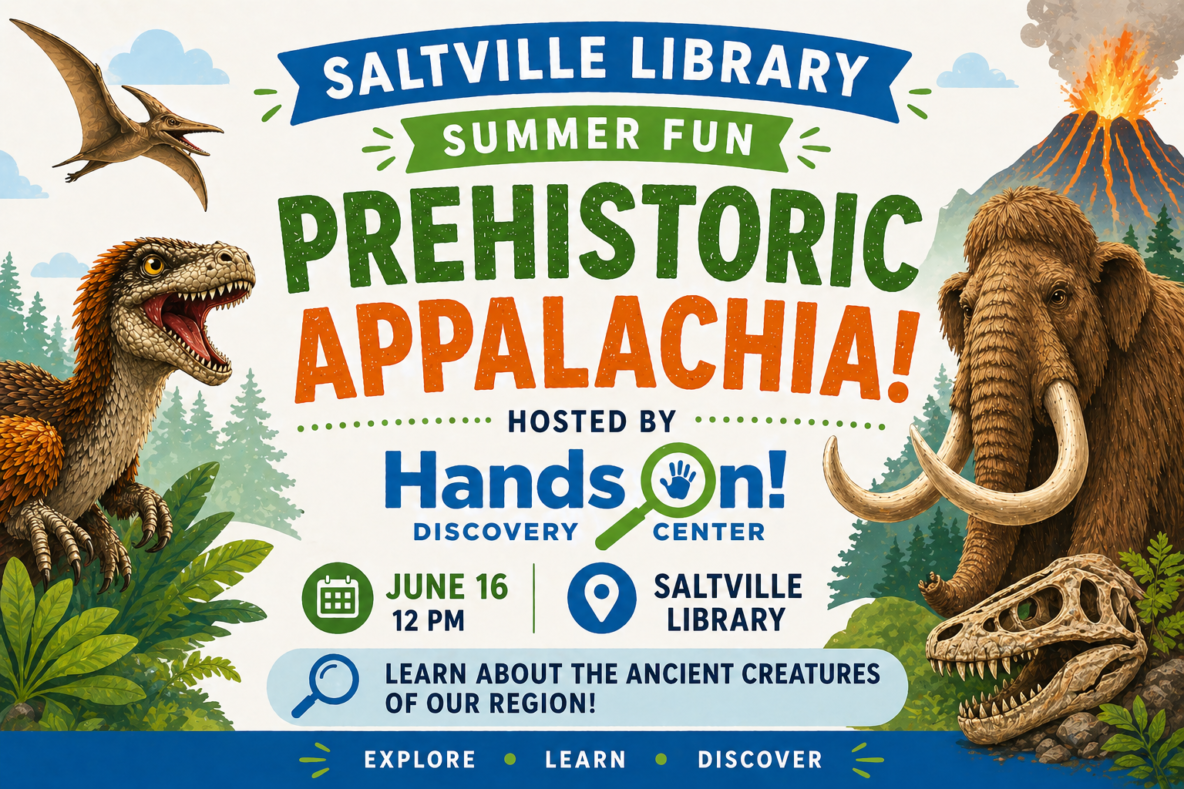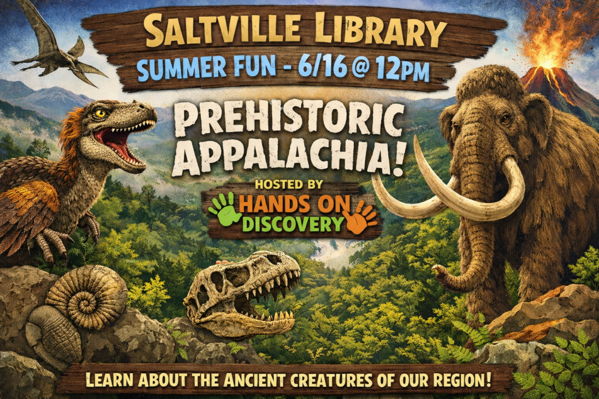 Join us at the Saltville Library for Summer Fun: Prehistoric Appalachia on June 16 at 12 PM, hosted by Hands on Discovery! Discover the ancient creatures that once roamed our mountains, get up close with fossils, and dive into hands-on learning that’s fun for all ages.