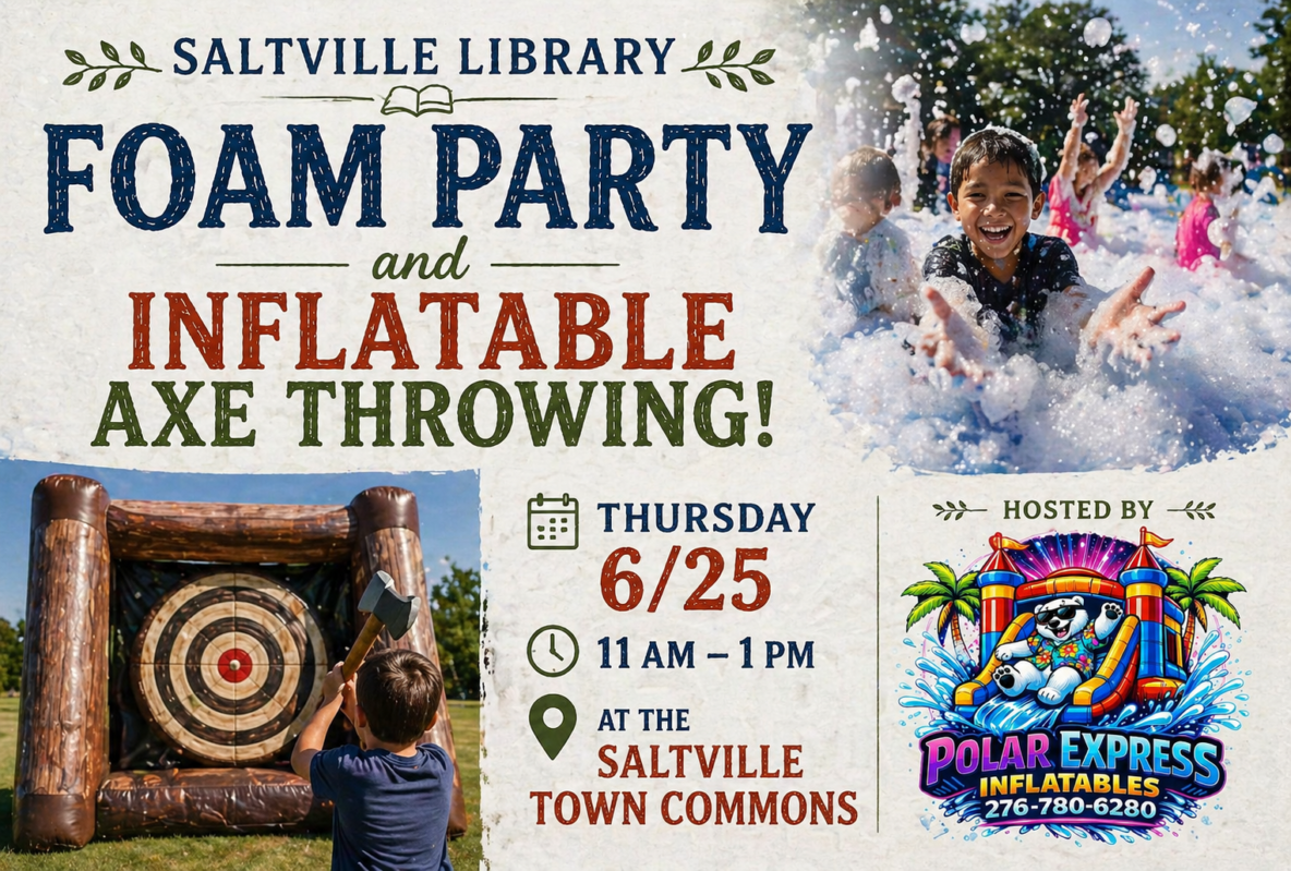 Join us at the Saltville Library for a Foam Party on June 25 at 11 AM at the Town Commons! Dive into mountains of bubbles, dance in the foam, and cool off with this high-energy summer celebration.