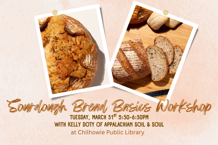 Interested in learning more about the process of sourdough bread baking? Join us at Chilhowie Library for an evening class that starts at 5:30pm. Kelly Doty of Appalachian Soil & Soul will explain the process of San Francisco style sourdough and give tips for having the best bread results. The cost is $10 per person to attend. Everyone will get to take home a container of bread starter. Bring your own glass jar from home if you like, otherwise participants will receive a small plastic cup with starter.