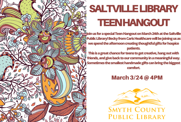 Join us for a special Teen Hangout on March 24th at the Saltville Public Library! Becky from Caris Healthcare will be joining us as we spend the afternoon creating thoughtful gifts for hospice patients. This is a great chance for teens to get creative, hang out with friends, and give back to our community in a meaningful way. Sometimes the smallest handmade gifts can bring the biggest comfort!