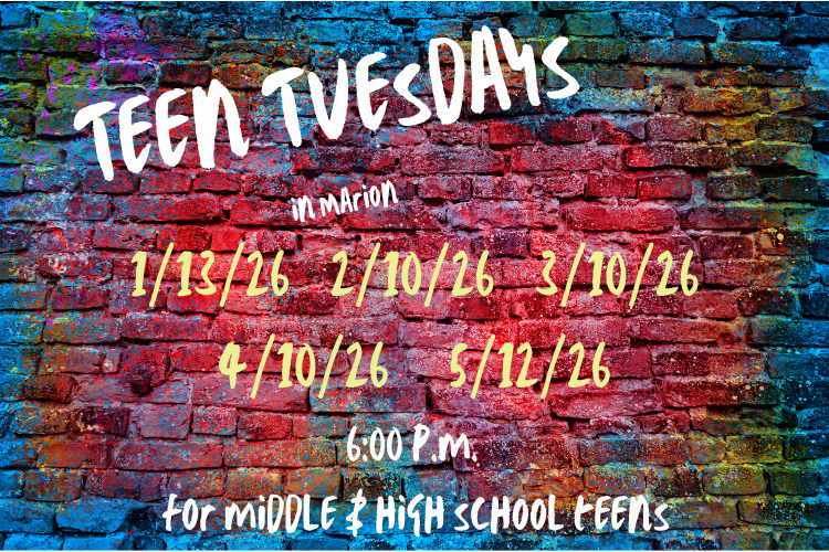 Teen Tuesdays in Marion Date: January 13, 2026 Add to Calendar Google CalendarMicrosoft OutlookApple CalendarDownload Time: 6:00 pm - 7:00 pm Recurrence: Monthly from January 13, 2026 until May 12, 2026 Calendar: Marion Branch, Smyth County Public Libraries Upcoming Teen Tuesdays in Marion February 10, 2026March 10, 2026April 14, 2026May 12, 2026