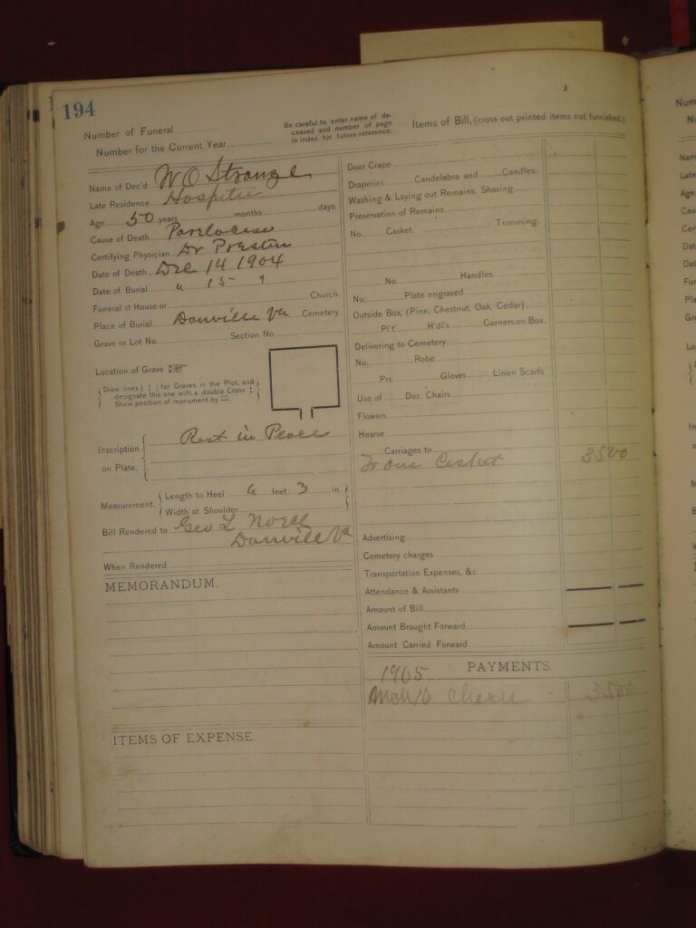 Seaver Brown-Book 5-Page 194 Click for full size Description Color photograph of Seaver Brown Book 5-Page 194 Collection Funeral Home RecordsSeaver Brown Funeral Home Records Book #5Seaver-Brown Funeral Home Identifier sbrl:6288 Subject Seaver Brown Funeral Home Funeral Home Records Marion, Virginia Strange, W.O. Noell, George L. Contributor(s) Seaver Brown Funeral Home ©2025 Smyth County Public Libraries. All rights reserved.